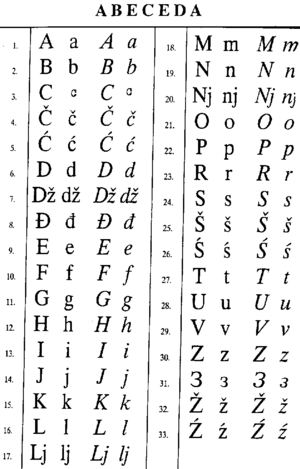 | Latin | A | B | C | Č | Ć | D | Dž | Đ | E | F | G | H | I | J | K | L | Lj | M | N | Nj | O | P | R | S | Š | Ś | T | U | V | Z | Ž | Ź |