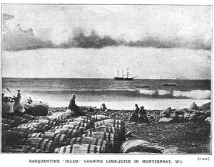 The first lime tree orchards on the island were planted in 1852 by a local planter, Mr Burke.[36] In 1857, the British philanthropist Joseph Sturge bought a sugar estate to prove that it was economically viable to employ paid labour rather than use slaves.[20] Numerous members of the Sturge family bought additional land. In 1869, the family established the Montserrat Company Limited and planted Key lime trees; started the commercial production of lime juice, with more than 100,000 gallons produced annually by 1895; set up a school; and sold parcels of land to the inhabitants of the island. The pure lime juice was transported in casks to England, where it was clarified and bottled by Evans, Sons & Co, of Liverpool, with a trade mark on each bottle intended to guarantee quality to the public.[25]