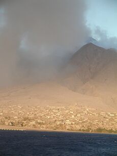 On 18 July 1995, the previously dormant Soufrière Hills volcano in the southern end of the island became active and its eruptions destroyed Plymouth, Montserrat's Georgian era capital city situated on the west coast. Between 1995 and 2000, two-thirds of the island's population was forced to flee, mostly to the United Kingdom, leaving fewer than 1,200 people on the island in 1997. (The population had increased to nearly 5,000 by 2016).[10][11] The volcanic activity continues, mostly affecting the vicinity of Plymouth, including its docks, and the eastern side of the island around the former W. H. Bramble Airport, the remnants of which were buried by flows from further volcanic activity on 11 February 2010.