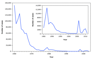 The United States began to vaccinate against mumps in the 1960s, with other countries following suit.[3] From 1977 to 1985, 290 cases per 100,000 people were diagnosed each year worldwide.[10] Although few countries recorded mumps cases after they began vaccination, those that did reported dramatic declines. From 1968 to 1982, cases declined by 97% in the U.S., in Finland cases were reduced to less than one per 100,000 people per year,[11] and a decline from 160 cases per 100,000 to 17 per 100,000 per year in England was observed from 1989 to 1995.[12] By 2001, there had been a 99.9% reduction in the number of cases in the U.S. and similar near-elimination in other vaccinating countries.[3]