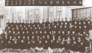 The university was founded as a private institution in 1919.[11] Nankai's scale was relatively small at its inception partly because it received no funding from the government but instead was funded by foreign charitable funds and local entrepreneurs, with only 3 departments (liberal arts, science, and business) and 96 students.[12] It was noted particularly for its courses which were taught in English using foreign curricula and textbooks.[بحاجة لمصدر]
