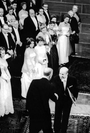 ملڤين كالڤن يتسلم جائزة نوبل في قاعة كونشرتو ستوكهولم، عام 1961.