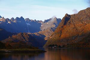 Norway's second-largest glacier, Svartisen,[4] the second-largest lake, Røssvatnet, and the second-deepest fjord, Tysfjorden (897 m) are all located in Nordland. The largest river (waterflow) is Vefsna which forms the Laksforsen waterfall.[5]