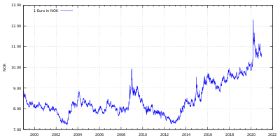 سعر صرف واحد يورو بالكرونة النرويجية (من عام 1999).