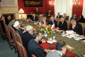 الاجتماع الأول لإيران EU-3، قصر سعد آباد، طهران، 21 أكتوبر 2003. في الصورة وزراء الاتحاد الأوروبي الثلاثي وكبير المفاوضين الإيرانيين حسن روحاني