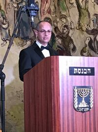 عمر ياغي أثناء مراسم تسليم جائزة وولف في الكيمياء 2018، الكنيست الإسرائيلي.
