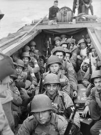 On 8 November 1942, the invasion commenced with landings on three beaches—two west of Algiers and one east. The landing forces were under the overall command of Major-General Charles W. Ryder, commanding general of the U.S. 34th Infantry Division. The 11th Brigade Group from the British 78th Infantry Division landed on the right hand beach; the US 168th Regimental Combat Team, from the 34th Infantry Division, supported by 6 Commando and most of 1 Commando, landed on the middle beach; and the US 39th Regimental Combat Team, also from the US 34th Infantry Division, supported by the remaining 5 troops from 1 Commando, landed on the left hand beach. The 36th Brigade Group from the British 78th Infantry Division stood by in floating reserve.[34] Though some landings went to the wrong beaches, this was immaterial because of the lack of French opposition. All the coastal batteries had been neutralized by the French Resistance and one French commander defected to the Allies. The only fighting took place in the port of Algiers, where in Operation Terminal, two British destroyers attempted to land a party of US Army Rangers directly onto the dock, to prevent the French destroying the port facilities and scuttling their ships. Heavy artillery fire prevented one destroyer from landing but the other was able to disembark 250 Rangers before it too was driven back to sea.[27] The US troops pushed quickly inland and General Juin surrendered the city to the Allies at 18:00.