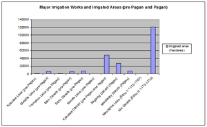 Surviving records provide a glimpse of the kingdom's economic life. A pe (ပယ်, 0.71 hectare) of fertile land near Pagan cost 20 silver kyats but only 1 to 10 kyats away from the capital. Construction of a large temple in the reign of Sithu II cost 44,027 kyats while a large "Indian style" monastery cost 30,600 kyats.[12] Manuscripts were rare and extremely costly. In 1273, a complete set of the Tripiṭaka cost 3000 kyats.[15]