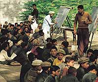 التلاميذ في الريف الباكستاني يتلقون دروسهم في الهواء الطلق نظرًا لقلة حجرات الدراسة، وتعاني باكستان من النقص الشديد في عدد المدارس والمعلمين.