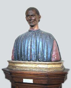 This was Machiavelli's office when he was Secretary of the Republic. His polychrome bust in terracotta and his portrait are by Santi di Tito. They are probably modelled on his death mask.