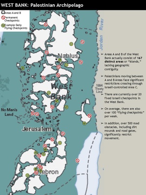 ارتفع عدد نقاط التفتيش ، بما في ذلك الحواجز والسواتر الترابية والخنادق ، من 376 في آب 2005 إلى 540 في كانون الأول 2006. نقاط التفتيش هذه تقسم الضفة الغربية إلى أربع مناطق مختلفة: الشمال (نابلس وجنين وطولكرم) ، والوسط (رام الله). ) والجنوب (الخليل) والقدس الشرقية. داخل هذه المناطق ، تم إنشاء جيوب أخرى بواسطة نظام من نقاط التفتيش وحواجز الطرق. علاوة على ذلك ، فإن الطرق السريعة التي يستخدمها الإسرائيليون تزيد فقط من تجزئة الأرض الفلسطينية المحتلة إلى 10 كانتونات أو بانتوستانات صغيرة.