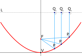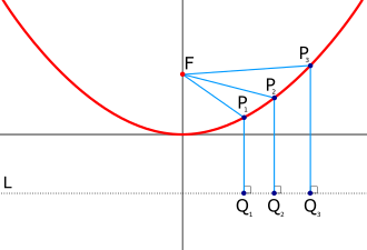 أي خط FP يصل بين البؤرة وأي نقطة على القطع المكافئ يتساوى في الطول مع أي خط QP مرسوم عموديًا من هذه النقطة الواقعة على القطع المكافئ إلى الدليل ويقطعه في النقطة Q.
