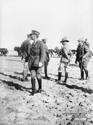 With the war on the Western Front bogged down in trench warfare, Chetwode was transferred to Palestine where he was given command of the Desert Column and promoted to temporary lieutenant general with effect from 22 November 1916.[17] He led the corps at Rafa in January 1917 and at the First Battle of Gaza in March 1917.[18] When General Sir Edmund Allenby, a fellow cavalryman, took command of the Allied forces in Palestine in June 1917, Chetwode was promoted to command of XX Corps.[18] He led his corps to military success at the Battle of Beersheba in October 1917 and at the Battle of Jerusalem in November 1917.[19] During the Sinai and Palestine campaign he was mentioned in despatches eight times.[18]