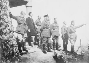 During the war, Chetwode served on the Western Front: his 5th Cavalry Brigade helped cover the retreat from the frontier, and checked the pursuing Germans at Cerizy on 29 August 1914.[4] After taking part in the First Battle of Ypres in October 1914, he was appointed general officer commanding (GOC) 2nd Cavalry Division, and along with it came a temporary promotion to major general on 15 July 1915[15] and to substantive major general on 1 January 1916.[16]