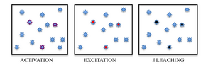 Immobilized fluorescent proteins being photoactivated, excited and bleached