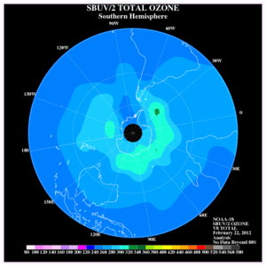 يحدث نضوب الأوزون داخل الدوامات القطبية- خاصة فوق نصف الكرة الجنوبي - حيث يصل النضوب إلى أقصاه في فصل الربيع.