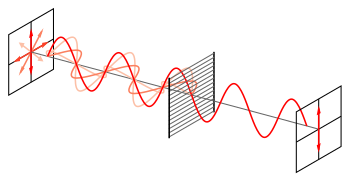 نلاحظ في الشكل أنه إذا كان اهتزاز الموجة يحدث في اتجاه الفتحة فإن الموجة ستنفذ خلال الفتحة وفي هذه الحالة تسمى موجة مستقطبة خطيا linearly polarized wave أي أن الموجة تمر في الفتحة إذا كان اتجاه استقطابها موازيا لاتجاه الفتحة أما عندما تكون الفتحة متعامدة مع اتجاه استقطاب الموجة فإن الموجة لا تمر. ويسمى الاتجاه الذي يحدث فيه اهتزاز الموجة المستقطبة خطيا باتجاه الاستقطاب polarization axis وإذا اعتبرنا الموجة الكهرومغناطيسية سنجد أن الموجة تنتشر في اتجاه محور السينات مثلا أو المحور x ويتذبذب المجال الكهربى في اتجاه محور الصادات أو المحور y بينما يتذبذب المجال المغناطيسى في اتجاه المحور ع أو.المحورz