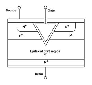 In this power MOSFET structure, also called trench-MOS, the gate electrode is buried in a trench etched in the silicon. This results in a vertical channel. The main interest of the structure is the absence of the JFET effect. The name of the structure comes from the U-shape of the trench.