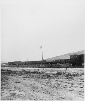Promontory was the site of Promontory City during and shortly after the construction of the transcontinental railroad.[12] However, by December 1869, the shops, tents, and store fronts were being dismantled as the traders and merchants moved to other towns.[12] In January 1870, the train crews from the CP and UP had been relocated to Ogden, Utah, where Union Station had effectively become the meeting point of the two railroads. Promontory Station had a CP station agent and telegraph operator, a Chinese section gang, and gravel train crew.[12] By June 1870, the population at Promontory Summit had been reduced to about 120 people. Most were employees of the CP railroad. The only exceptions were a hotel/eatery owner, his family, and 80 miners of copper sulfate.[12]