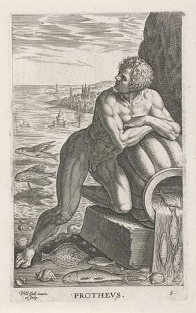 The children of Proteus by Torone (Chrysonoe) of Phlegra were Polygonus (Tmolus) and Telegonus. They both challenged Heracles at the behest of Hera and were killed by the hero.[9] Another son of Proteus, Eioneus, became the father of Dymas, king of Phrygia, father of Hecuba.[10] By the Nereid Psamathe, Proteus fathered Theoclymenos and Theonoe[11] (Eidothea[12] or Eurynome[13]). Cabeiro, mother of the Cabeiri and the three Cabeirian nymphs by Hephaestus, was also called the daughter of Proteus.[14] Other daughters were Rhoiteia who gave her name to the city of Rhoiteion in Troad,[15] Thebe who became the eponym of Thebes in Egypt[16] and Thaicrucia who mothered Nympheus by Zeus.[17]