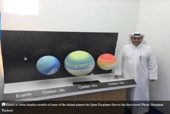 - عام 2011، أعلن مسح قطر للكواكب الخارجية عن اكتشاف قطر-1ب، وهو كوكب مشتري ساخن له معايير مشابهة لكوكب المشتري.[6]