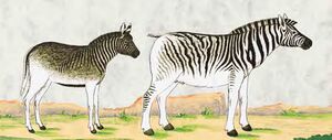 Different subspecies of plains zebras were recognised as members of Equus quagga by early researchers, though much confusion existed over which species were valid.[12] Quagga subspecies were described on the basis of differences in striping patterns, but these differences were since attributed to individual variation within the same populations.[13] Some subspecies and even species, such as E. q. danielli and Hippotigris isabellinus, were based only on illustrations (iconotypes) of aberrant quagga specimens.[14][15] One craniometric study from 1980 seemed to confirm its affiliation with the horse (Equus ferus caballus), but early morphological studies have been noted as being erroneous. Studying skeletons from stuffed specimens can be problematical, as early taxidermists sometimes used donkey and horse skulls inside their mounts when the originals were unavailable.[16][11]