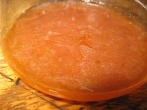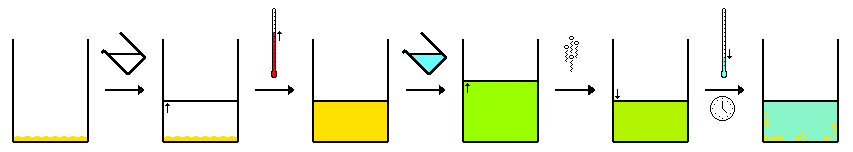→ Solvent added (clear) to compound (orange) to give compound solution (orange) → Vessel sealed but a small hole allows solvent vapour (clear) to slowly evaporate from compound solution (orange) over time to give crystals (orange) and a saturated solution (pale-orange).