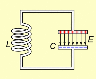 Animation illustrating electrical resonance in a tuned circuit, consisting of a capacitor (C) and an inductor (L) connected together. Charge flows back and forth between the capacitor plates through the inductor. Energy oscillates back and forth between the capacitor's electric field (E) and the inductor's magnetic field (B).