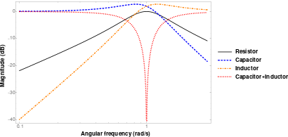 Suppose that the output voltage of interest in the RLC circuit is the voltage across the inductor and the capacitor combined in series. Equation (4) showed that the sum of the voltages across the three circuit elements sums to the input voltage, so measuring the output voltage as the sum of the inductor and capacitor voltages combined is the same as vin minus the voltage drop across the resistor. The previous example showed that at the natural frequency of the system, the amplitude of the voltage drop across the resistor equals the amplitude of vin, and therefore the voltage across the inductor and capacitor combined has zero amplitude. We can show this with the transfer function.