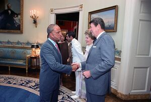 In 1979, Cohn became a member of the Western Goals Foundation; he served on the board of directors with Edward Teller.[43] Although he was registered as a Democrat, Cohn supported most of the Republican presidents of his time and Republicans in major offices across New York.[1] He maintained close ties in conservative political circles, serving as an informal advisor to Richard Nixon and Ronald Reagan.[44] While aligning himself with Republicans he simultaneously forged close ties to Democrats including New York mayor Ed Koch,[43] Secretary of State Carmine DeSapio,[39] and Brooklyn party boss Meade Esposito.[45]