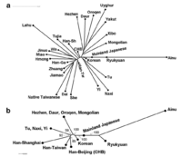 According to archaeological evidence, there is a prehistoric cultural differentiation between the Northern Ryukyu Islands (Amami Islands and Okinawa Islands) and the Southern Ryukyu Islands (Miyako Islands and Yaeyama Islands). The genome-wide differentiation was pronounced, especially between Okinawa and Miyako. It is considered to have arisen due to genetic drift rather than admixture with people from neighboring regions, with the divergence dated to the Holocene, and without major genetic contribution of the Pleistocene inhabitants to the present-day Southern Islanders.[40] The Amami Islanders are also slightly more similar to the mainland population than the Okinawa Islanders.[41] An autosomal DNA analysis from Okinawan samples concluded that they are most closely related to other Japanese and East Asian contemporary populations, sharing on average 80% admixture with mainland Japanese and 19% admixture with Chinese population, and that have isolate characteristics.[33] The population closest to Ryukyu islanders is the mainland Japanese, followed by the Korean and Chinese populations. However, Taiwan aborigines were genetically distant from the Ryukyu islanders, even though these populations are geographically very close.[39]