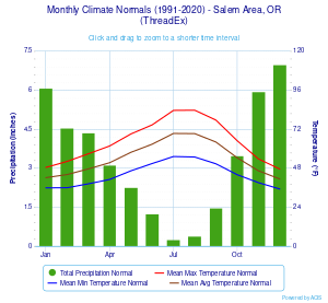 Salem's mean annual temperature is 54.1 °F (12.3 °C);[22] its annual precipitation is 40.08 بوصات (1،018 mm), with an average 3.5 بوصات (8.9 cm) of snow included. However, over a quarter of years receive no snowfall.[22] The state capital is about 47 mi (76 km) south of Portland, but actually has a lower average temperature than that of Portland (54.4 °F أو 12.4 °C),[22] due in part to the lower daily minima.