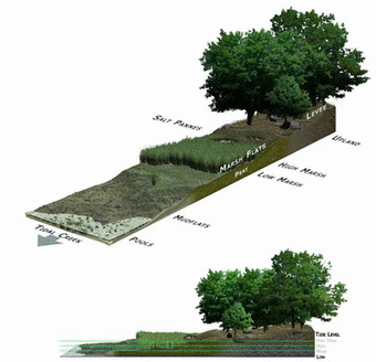 Coastal salt marshes can be distinguished from terrestrial habitats by the daily tidal flow that occurs and continuously floods the area.[1] It is an important process in delivering sediments, nutrients and plant water supply to the marsh.[5] At higher elevations in the upper marsh zone, there is much less tidal inflow, resulting in lower salinity levels.[1] Soil salinity in the lower marsh zone is fairly constant due to everyday annual tidal flow. However, in the upper marsh, variability in salinity is shown as a result of less frequent flooding and climate variations. Rainfall can reduce salinity and evapotranspiration can increase levels during dry periods.[1] As a result, there are microhabitats populated by different species of flora and fauna dependent on their physiological abilities. The flora of a salt marsh is differentiated into levels according to the plants' individual tolerance of salinity and water table levels. Vegetation found at the water must be able to survive high salt concentrations, periodical submersion, and a certain amount of water movement, while plants further inland in the marsh can sometimes experience dry, low-nutrient conditions. It has been found that the upper marsh zones limit species through competition and the lack of habitat protection, while lower marsh zones are determined through the ability of plants to tolerate physiological stresses such as salinity, water submergence and low oxygen levels.[16][17]