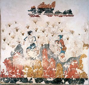 The island is the site of one of the largest volcanic eruptions in recorded history: the Minoan eruption (sometimes called the Thera eruption), which occurred some 3,600 years ago at the height of the Minoan civilization.[4] The eruption left a large caldera surrounded by volcanic ash deposits hundreds of metres deep. This may have led indirectly to the collapse of the Minoan civilization on the island of Crete, 110 km (68 mi) to the south, through a gigantic tsunami. Another popular theory holds that the Thera eruption is the source of the legend of Atlantis.[6]