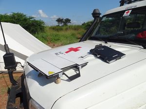 Portable مودم وهوائي إنترنت ساتلي منتشر مع الصليب الأحمر في جنوب السودان.