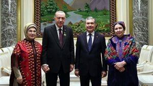 السيدة عطايف بردي‌محمدوڤ، والدة الرئيس سردار بردي‌محمدوڤ، برفقة الرئيس التركي رجب طيب أردوغان وقرينته.