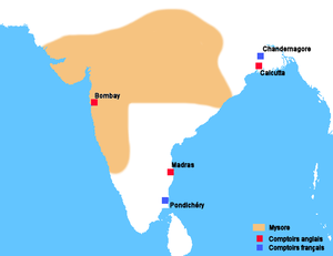وفي غضون ذلك كانت روح المغامرة البريطانية-الحربية والبحرية، والتجارية-مشغولة بالتهام الهند-فقد أقامت شركة الهند الشرقية الإنجليزية معاقل لها في مدراس (1639)، وبمباي (1668) وبوندتشيري، جنوبي مدراس (1683)، وفي شندرناجور شمال كلكتا. كل مراكز القوة هذه اتسعت في الوقت الذي اضمحل فيه حكم المغول في الهند، واستعمل كل فريق الرشوة والقوة العسكرية لمد منطقة نفوذه وكانت فرنسا وإنجلترا قد اشتبكتا معاً في الهند إبان حرب الوراثة النمساوية (1740-48) ولم يفعل صلح إكس لاشابل أكثر من قطع الصراع فترة، والآن جددته حرب السنين السبع. ففي مارس 1757 استطاع أسطول إنجليزي يقوده الأميرال تشارلز وطسن، ويعاونه جنود شركة الهند الشرقية بقيادة غلام من شرويشير يدعى روبرت كلايف أن ينتزع شندرناجور من الفرنسيين، وفي 23 يونيو، وبقوة لا تزيد على 3.200 جندي، هزم كلايف 50.000 هندوكي وفرنسي عند بلاسي (على ثمانين ميلاً شمال كلكتا) في معركة أكدت السيادة البريطانية على شمال شرقي الهند. وفي أغسطس 1758 طرد أسطول إنجليزي بقيادة الأميرال جورج بوكوك من المياه الهندية الأسطول الفرنسي الذي كان يحمي الممتلكات الفرنسية على طول الساحل. وبعد ذلك بفضل ما امتاز به البريطانيون على الفرنسيين من القدرة على جلب الرجال والمؤن، لم يكن انتصار إنجلترا إلا مسألة شهور. ففي 1759 أحبط وصول المؤن والإمداد البريطانية بحراً الحصار الفرنسي الذي فرضه على مدراس الكونت دلاللي. وهزم الفرنسيون هزيمة فاصلة في وانديووش في 22 يناير 1760، وسلمت بوندتشيري للبريطانيين في 16 يناير 1761 وقد ردت هذه المحطة الأمامية، وهي آخر المحطات الفرنسية إلى فرنسا 1763 ولكن كان مفهوماً للجميع أن بقاء السيادة للفرنسية رهن برضاء بريطانيا.