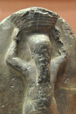 تفصيلة من تمثال حجري لشمش-شوم-أوكين حاملاً سلة. 668–655 ق.م.، من معبد نبو في Borsippa، العراق. حالياً موجود في المتحف البريطاني؟