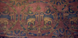 Commonly known as "Shu brocade" (蜀錦) in Chinese, Sichuan brocade is referred to as the "mother of brocade in China" given its age.[70] This technique of embroidery originates in the capital city of Chengdu during the time of the Ancient Kingdom of Shu. It enjoyed high popularity throughout the regions along the Silk Road, which stimulated an "exoticization" of the embroidery designs during the 1st millennium, with most of the patterns imported from Sogdia and other parts of Central Asia.[71] According to the Book of Sui, in the year 605 AD, the head of the Sichuan ateliers producing silks in the "western style" was a certain He Chou, a name which betrays his Sogdian origins.[72] Most of the silk products unearthed in Xinjiang (Chinese Turkestan) and Qinghai (Tuyuhun Kingdom) confirmed to be manufactured in Sichuan.[73]
