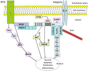 {{cite journal}}: CS1 maint: multiple names: authors list (link) - ^ Hehlgans, S. Haase, M. and Cordes, N. (2007). "Signaling via integrins: Implications for cell survival and anticancer strategies". Biochim. Biophys. Acta. 1775 (1): 163–180. PMID 17084981.