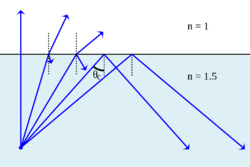 For example, consider a ray of light moving from water to air with an angle of incidence of 50°. The refractive indices of water and air are approximately 1.333 and 1, respectively, so Snell's law gives us the relation