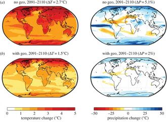 - ^ Parker, Andy; Irvine, Peter J. (مارس 2018). "The Risk of Termination Shock From Solar Geoengineering". Earth's Future (in الإنجليزية). 6 (3): 456–467. Bibcode:2018EaFut...6..456P. doi:10.1002/2017EF000735. S2CID 48359567.