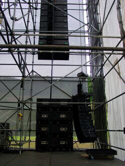 Professional sound reinforcement speaker systems often include dedicated hardware for safely flying them above the stage area, to provide more even sound coverage and to maximize sightlines within performance venues.