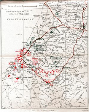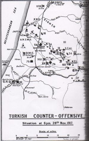 {{cite web}}: Check date values in:|date=(help) - "Egyptian Expeditionary Force General Staff Headquarters War Diary". First World War Diaries AWM4, 1-6-19 Part 2. Canberra: Australian War Memorial. November 1917.