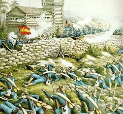 أول معركة كانت معركة خليج مانيلا حيث, في 1 مايو, 1898, Commodore George Dewey, commanding the U.S. Navy's Asiatic Squadron aboard the USS Olympia, in a matter of hours, defeated the Spanish squadron under Admiral Patricio Montojo y Pasarón. Dewey managed this while sustaining only one casualty, and that because of a heart attack.[10][11]