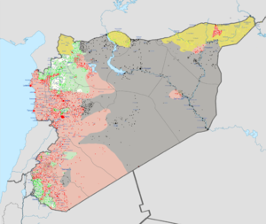 سوريا ، رسمياً الجمهورية العربية السورية، هي بلد في غرب آسيا، يحدها لبنان والبحر المتوسط من الغرب، تركيا من الشمال، العراق من الشرق، الأردن من الجنوب، وإسرائيل من الجنوب الغربي. عاصمتها دمشق وهي من بين أقدم المدن المأهولة بشكل مستمر في العالم.[15] بلد السهول الخصبة، الجبال العالية، والصحاري، تضم جماعات عرقية ودينية مختلفة، تشمل الأغلبية العربية والتي تضم؛ العلويين، الدروز، السنة والمسيحيين. الجماعات العرقية الأخرى تشمل؛ الأرمن، الآشوريين، الأكراد، اليزيديين والتركمان. يعتبر العرب السنة من أكبر الجماعات السكنية في سوريا.