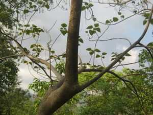 Teak is a large deciduous tree up to 40 m (131 ft) tall with grey to greyish-brown branches, known for its high-quality wood. Its leaves are ovate-elliptic to ovate, 15–45 cm (5.9–17.7 in) long by 8–23 cm (3.1–9.1 in) wide, and are held on robust petioles which are 2–4 cm (0.8–1.6 in) long. Leaf margins are entire.[7]
