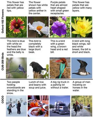 - ^ أ ب ت Reed, Scott; Akata, Zeynep; Logeswaran, Lajanugen; Schiele, Bernt; Lee, Honglak (June 2016). "Generative Adversarial Text to Image Synthesis" (PDF). International Conference on Machine Learning. arXiv:1605.05396.