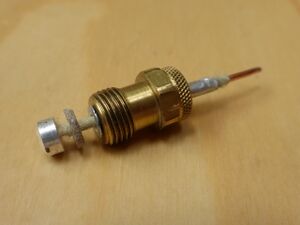 وصلة مزدوج حراري في أجهزة الغاز. الطرف الكروي (نقطة التلامس) على اليسار معزول عن الوصلة بواسطة حلقة عازلة. يتكون خط المزدوج الحراري من سلك نحاسي، وعازل، وغلاف معدني خارجي (عادةً نحاسي) يُستخدم أيضاً كمؤرض.[6]