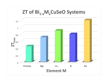 Materials suitable for high efficiency TEC systems must have a combination of low thermal conductivity and high electrical conductivity. The combined effect of different material combinations is commonly compared using a figure of merit known as ZT, a measure of the system's efficiency. The equation for ZT is given below, where is the Seebeck coefficient, is the electrical conductivity and is the thermal conductivity.[5]